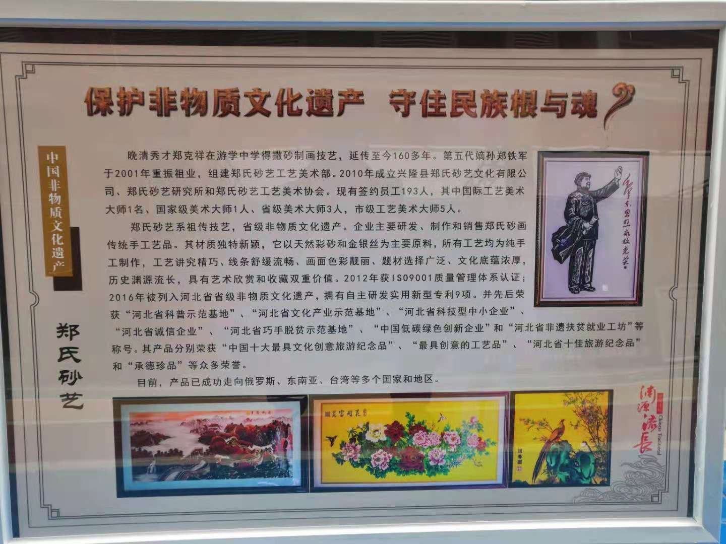 2021年5月15日,鄭氏砂藝應(yīng)邀參加三河市文化廣電和旅游局 “2021 年中國旅游日京津冀文旅資源推介暨 ‘京東文旅圈’成立”系列活動,活動旨在有效推動京津冀協(xié)同發(fā)展重大國家戰(zhàn)略,加快推進(jìn)興隆縣、遵化市、三河市等京東九縣(市、區(qū))一體化發(fā)展步伐,構(gòu)建文旅定位精準(zhǔn)清晰、資源高效利用、產(chǎn)業(yè)集群發(fā)展的區(qū)域發(fā)展新格局,共同打造京津冀文旅協(xié)同發(fā)展區(qū)。興隆縣旅游和文化廣電局局長莊云飛帶領(lǐng)我縣特色文旅企業(yè)參加了此次活動,其中鄭氏砂藝代表我縣非遺文化產(chǎn)業(yè)出席活動,展出特色砂畫作品51幅,展出效果良好,得到了參觀人員一致好評。