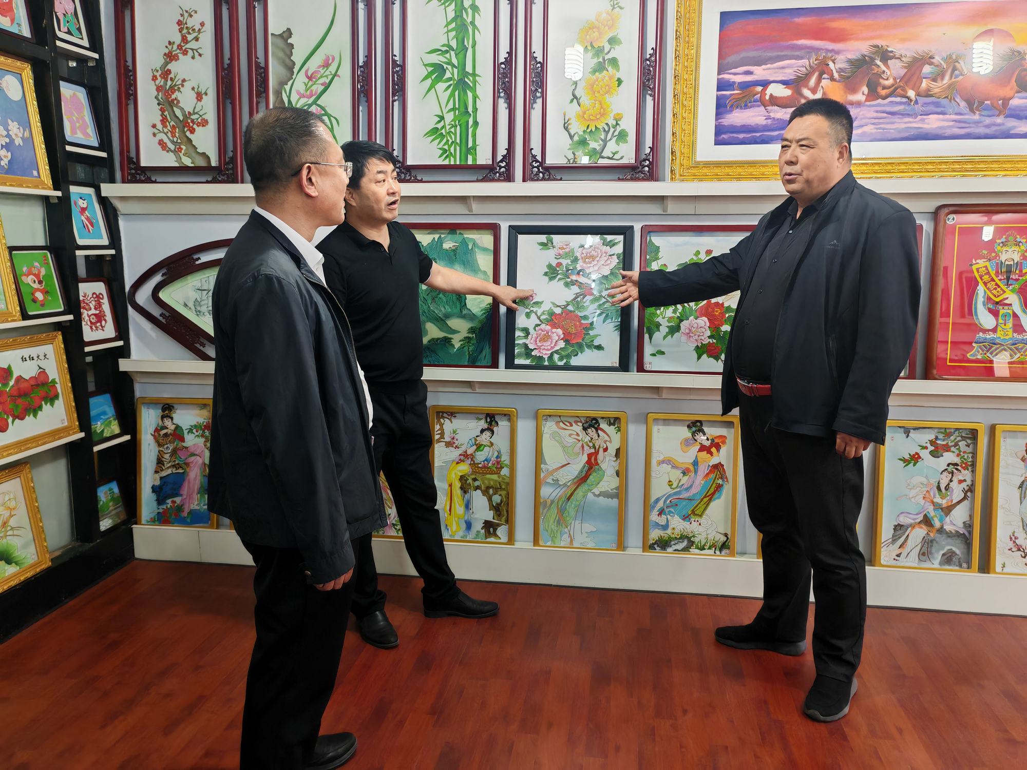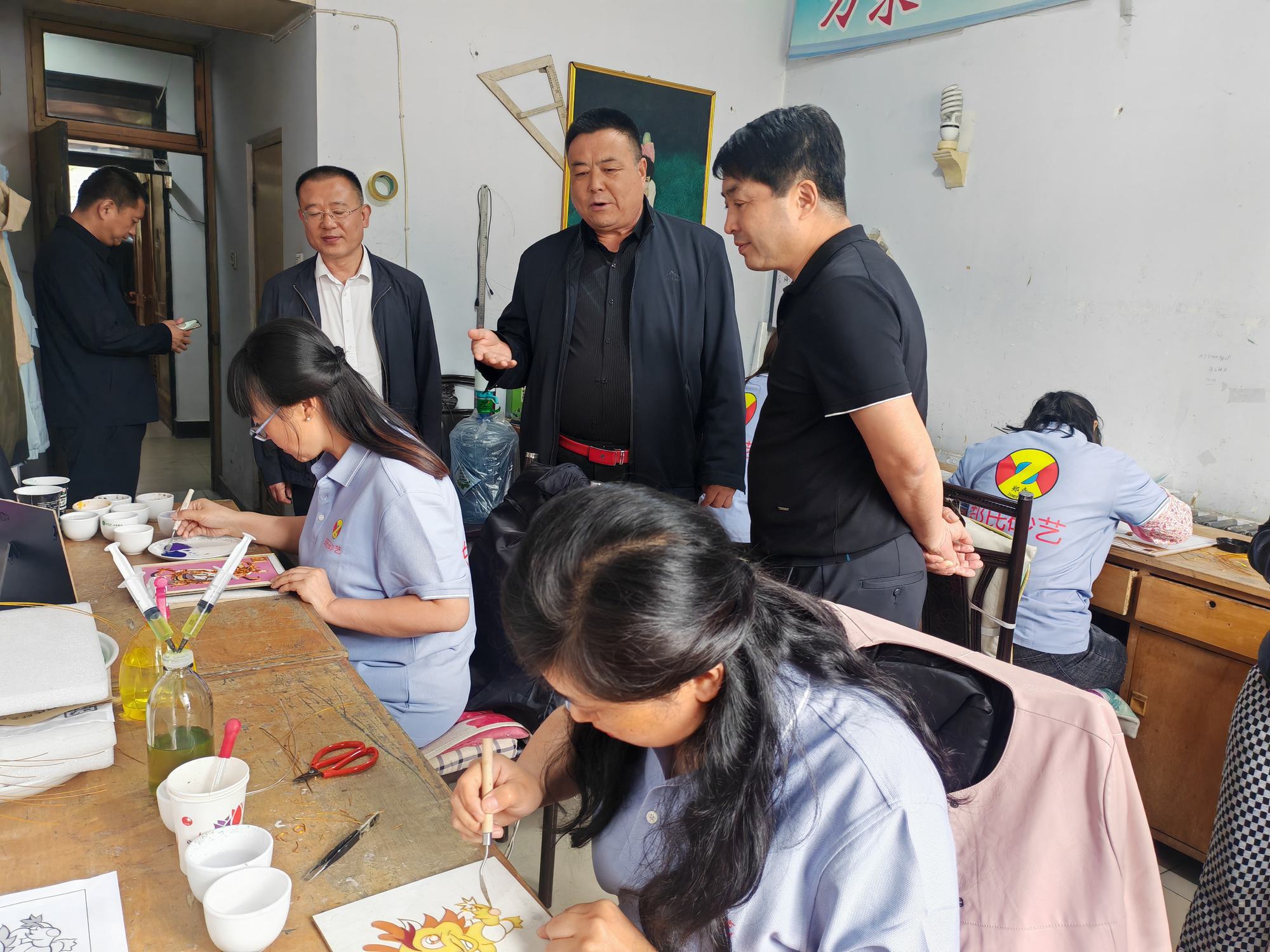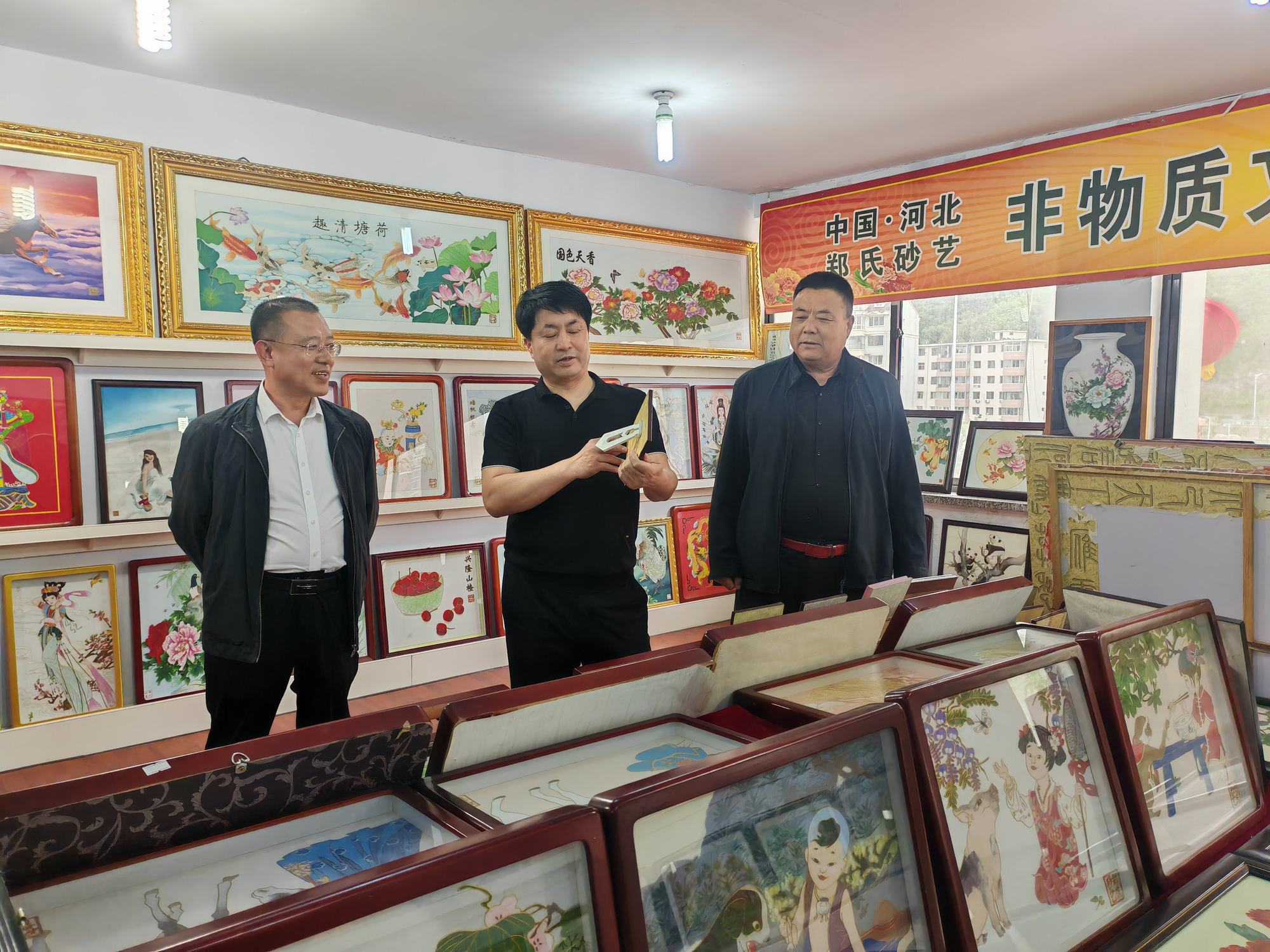 程志忠書記等一行在鄭氏砂藝董事長(zhǎng)鄭鐵軍的陪同下,參觀了鄭氏砂藝非遺文化展館,了解了鄭氏砂藝非遺文化的傳承和發(fā)展。隨后,實(shí)地觀察了鄭氏砂藝(畫)的制作過(guò)程,并與砂藝技師們進(jìn)行了交流,了解了砂畫制作原料和技藝手法。