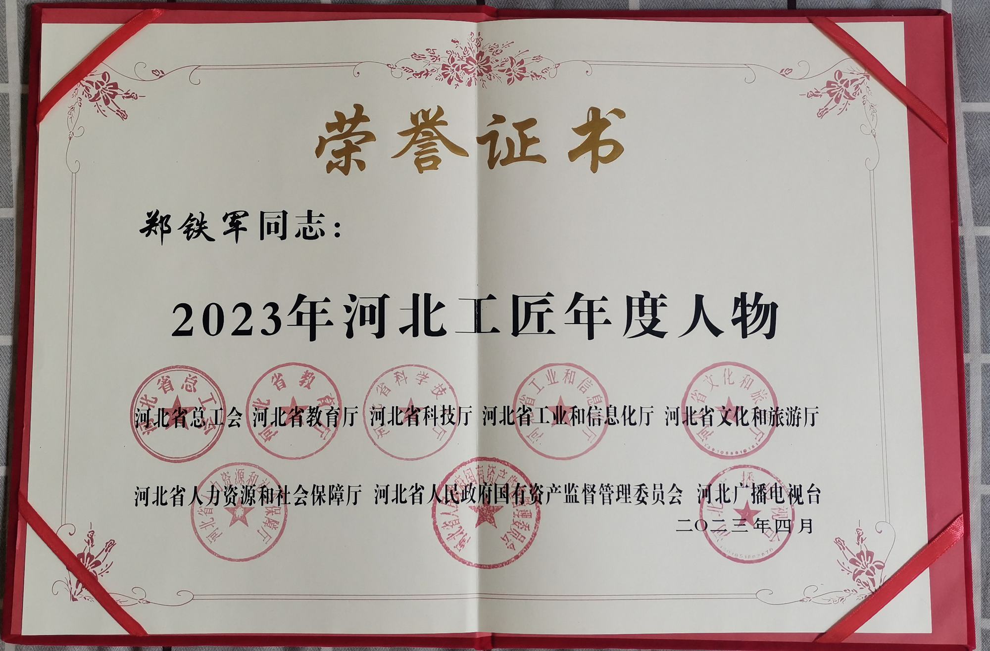 7月6日上午,2023年河北工匠、承德大工匠、承德工匠年度人物發(fā)布儀式在承德大劇院舉行,承德市委副書(shū)記蔣文冬,承德市委常委、宣傳部部長(zhǎng)趙青英,承德市人大常委會(huì)副主任郭士剛,承德市人民政府副市長(zhǎng)甄毓敏等相關(guān)領(lǐng)導(dǎo)出席了此次活動(dòng),并與工匠年度人物榮譽(yù)獲得者進(jìn)行合影留念。鄭氏砂藝(畫(huà))第五代非遺傳承人鄭鐵軍榮獲“2023年河北工匠年度人物”榮譽(yù)稱號(hào)。