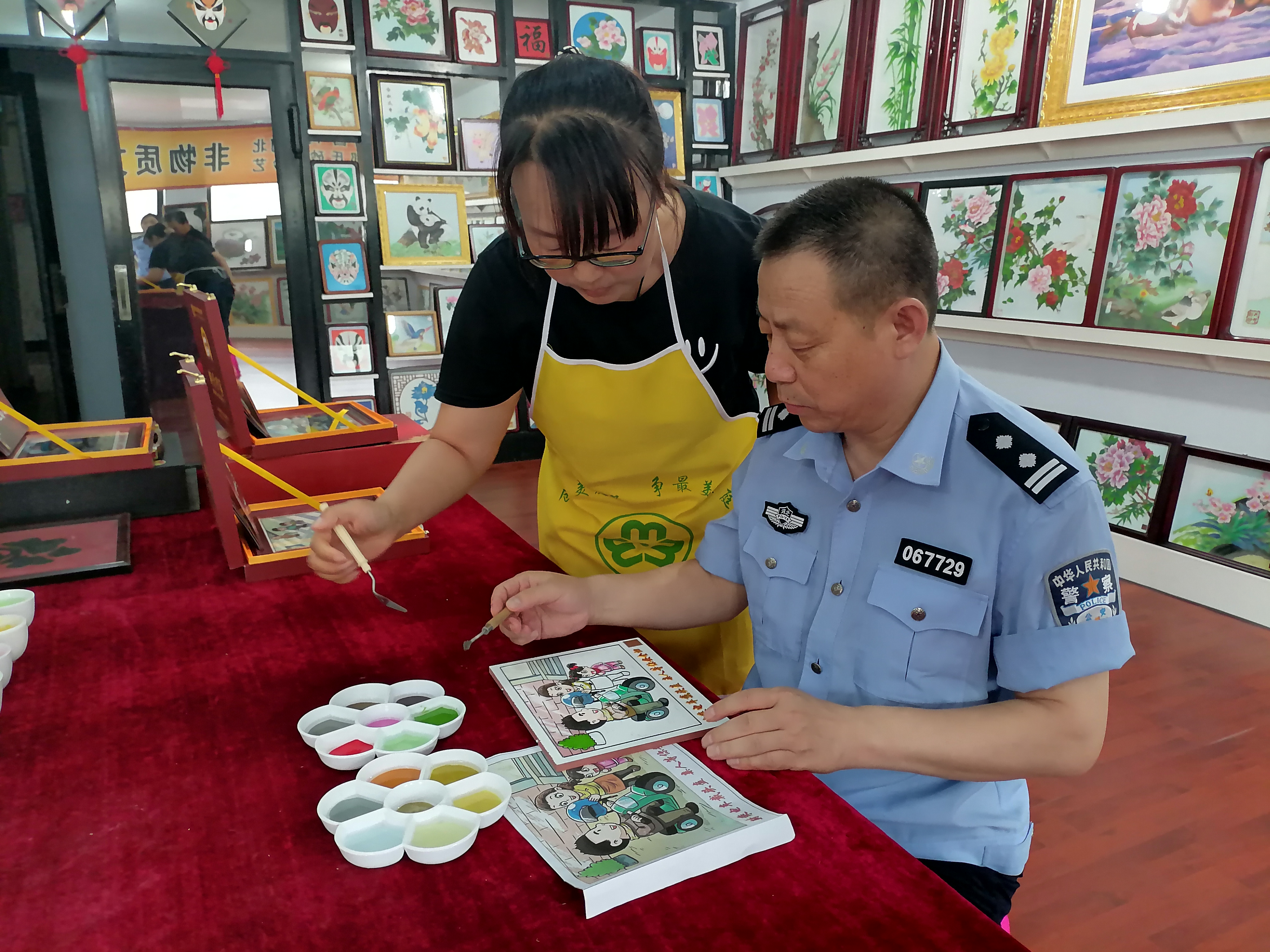 參觀過(guò)程中,鄭氏砂藝高級(jí)技師、河北省五一勞動(dòng)獎(jiǎng)?wù)芦@得者王鳳艷進(jìn)行了現(xiàn)場(chǎng)展演,新穎的制作材料、獨(dú)特的制作流程、精湛的制作技藝、精美的砂藝作品深深地吸引了來(lái)訪領(lǐng)導(dǎo)的目光。隨后,參觀領(lǐng)導(dǎo)親自動(dòng)手,與砂藝藝術(shù)家們共同創(chuàng)作了一幅以“騎乘電車戴頭盔,親人等你安全歸”為主題的砂藝作品。