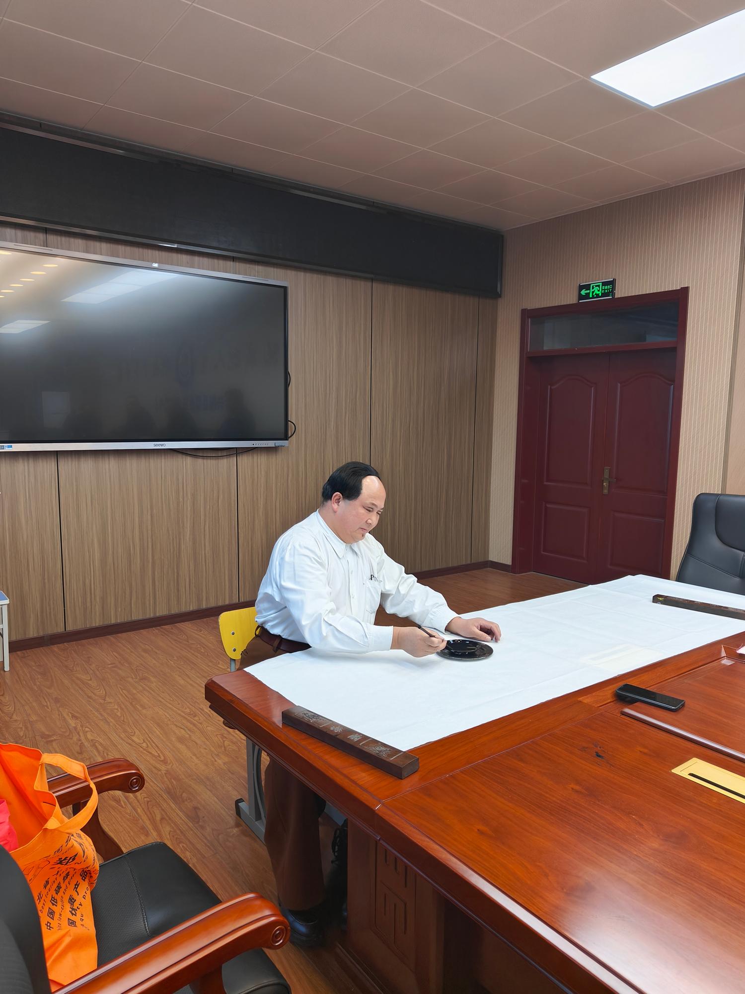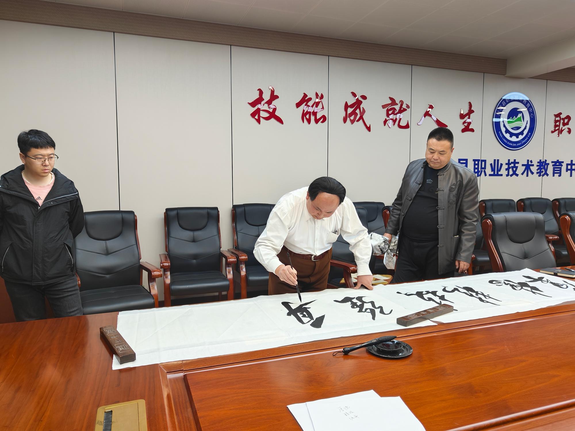 隨后,趙士奎老師移步至學(xué)校書法室,應(yīng)校領(lǐng)導(dǎo)的誠摯邀請,現(xiàn)場揮毫,為興隆縣職業(yè)教育中心題寫了校訓(xùn),即《厚德、精技、強(qiáng)身》。并書寫了詩詞《長征》,此作品不僅向偉人致敬,更激勵(lì)著廣大師生傳承和發(fā)揚(yáng)長征精神,為實(shí)現(xiàn)中華民族偉大復(fù)興的中國夢不懈奮斗。