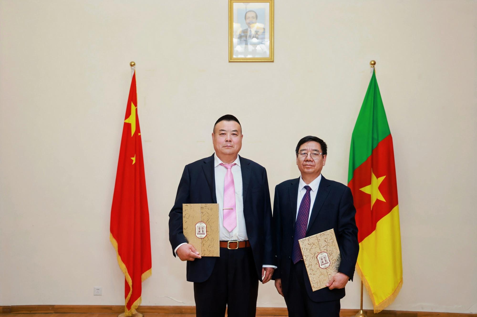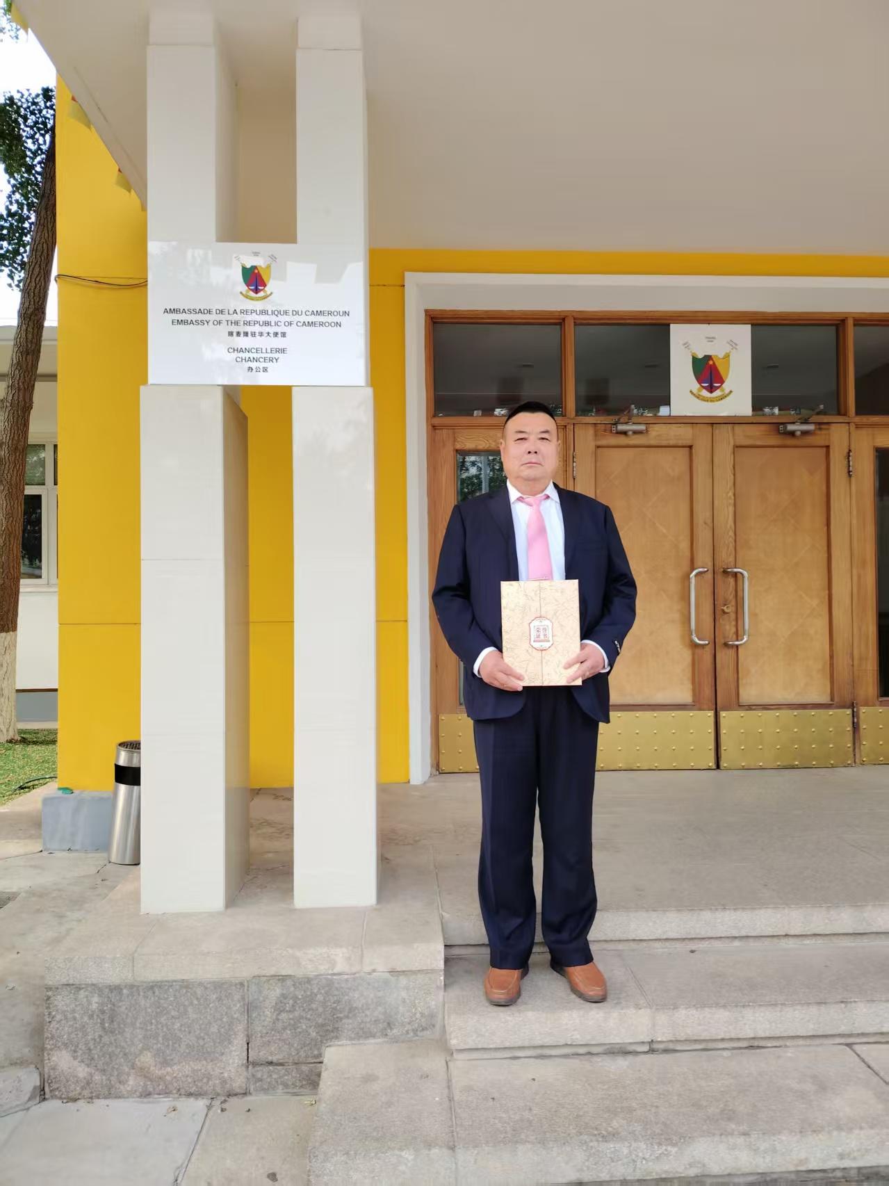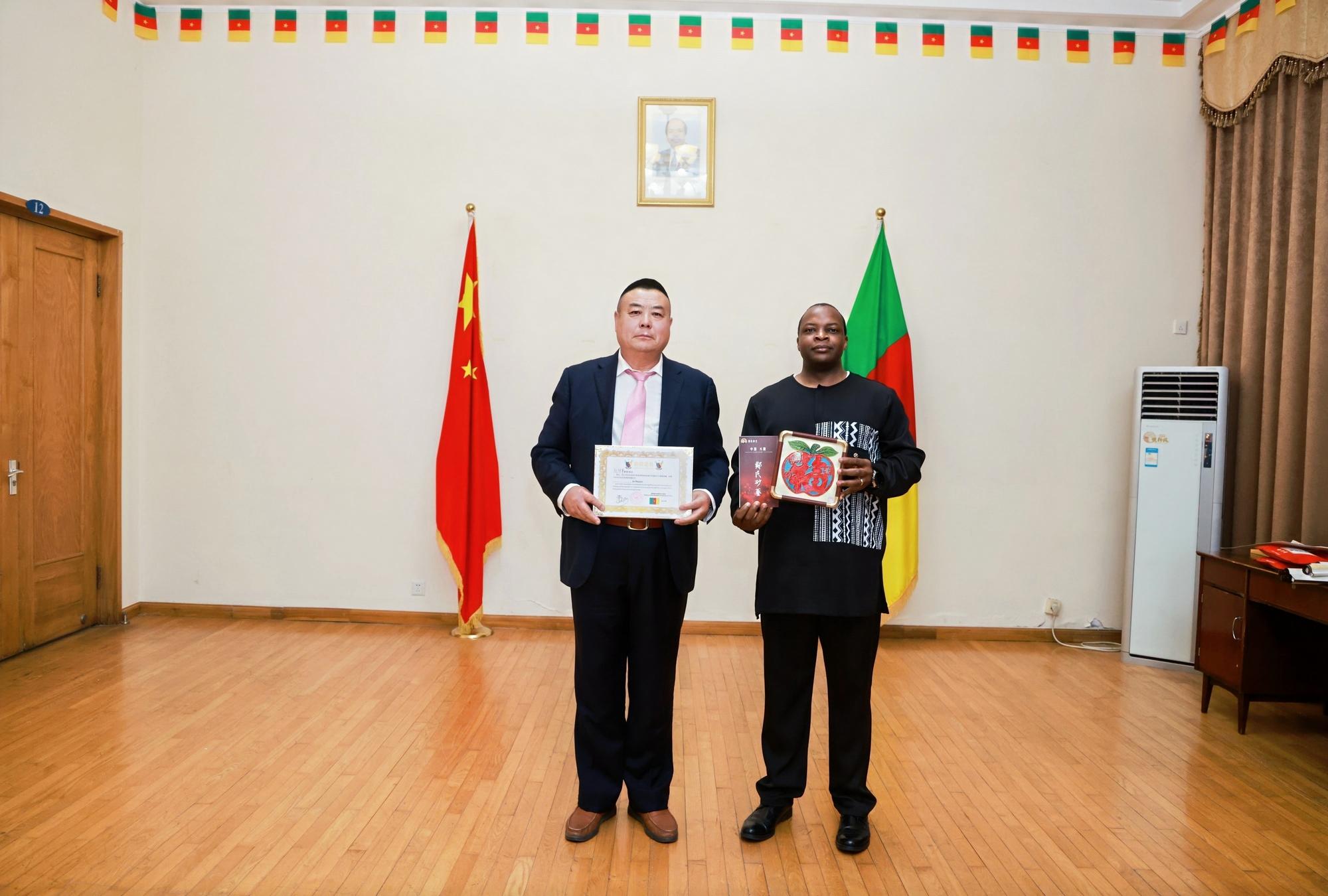 2025年4月26日,中名聯(lián)簽約國禮藝術(shù)家、非遺傳承人鄭鐵軍應(yīng)邀前往喀麥隆共和國駐華大使館,參與“一帶一路”中非文化交流活動?;顒蝇F(xiàn)場,其創(chuàng)作的非遺作品《平安福字》被喀麥隆大使館作為國禮永久收藏,標(biāo)志著河北興隆縣傳統(tǒng)手工藝在國際舞臺上的又一次精彩亮相,成為中非文化交流的重要載體??溌●v華使館外交官朱利安·弗雷迪·埃托瓦代表使館,向鄭鐵軍頒發(fā)收藏證書,并授予其“中非文化交流使者”榮譽稱號 。