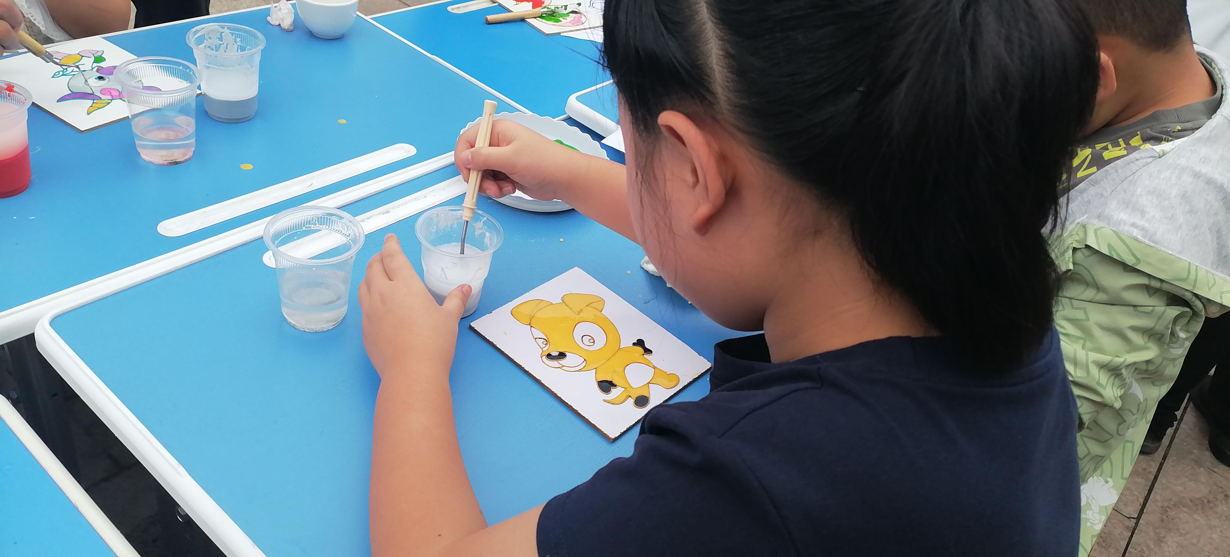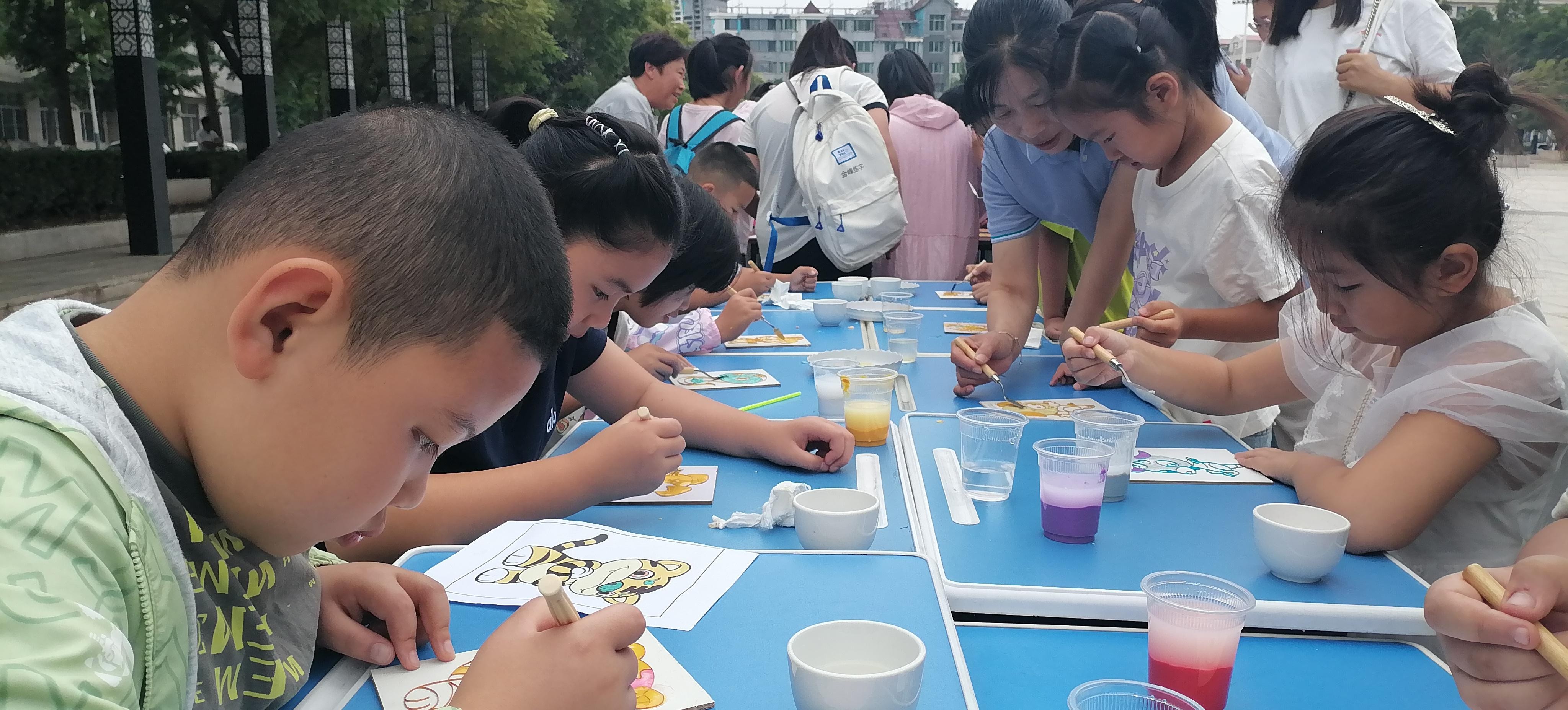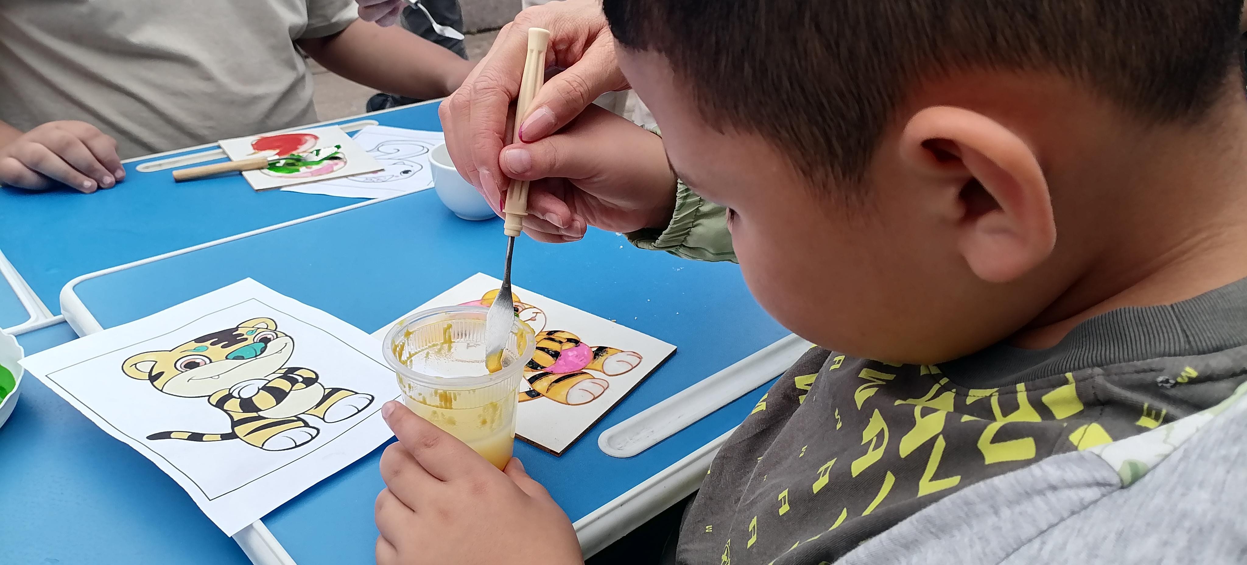 活動現(xiàn)場,鄭氏砂藝的“天然彩砂+金銀絲”工藝成為孩子們的“興趣焦點(diǎn)”。作為興隆縣的省級非遺項(xiàng)目,鄭氏砂藝以天然礦物彩砂為原料,采用金絲銀線勾勒圖案輪廓,再填充彩砂的傳統(tǒng)手法,既保留了鄉(xiāng)土文化特色,又蘊(yùn)含著非遺技藝的巧思。為讓孩子們輕松參與,技師們特意提前制作了粘好金絲的半成品——一幅幅待填充的砂畫作品,將“最精彩的創(chuàng)作環(huán)節(jié)”留給孩子。“我要給小虎的臉涂綠色!”“我喜歡藍(lán)色的眼睛!”孩子們圍坐桌前,手持作畫小鏟,認(rèn)真地將色彩砂石填入金絲框架,同時互相交流“配色秘訣”,現(xiàn)場充滿了童真與熱鬧。