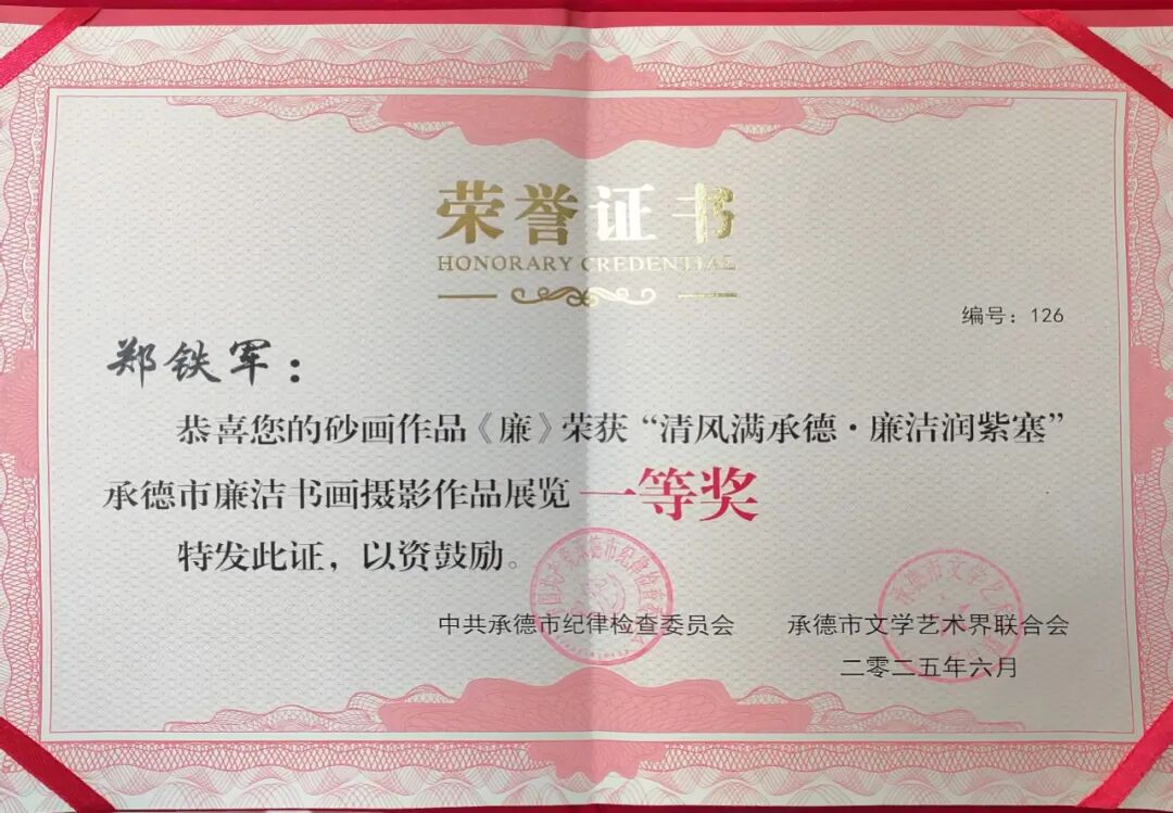 近日,“清風(fēng)滿承德·廉潔潤紫塞”承德市廉潔書畫攝影作品展覽評選結(jié)果揭曉,砂藝創(chuàng)作者鄭鐵軍的作品《廉》榮獲一等獎。該獎項由中共承德市紀律檢查委員會、承德市文學(xué)藝術(shù)界聯(lián)合會聯(lián)合頒發(fā)。